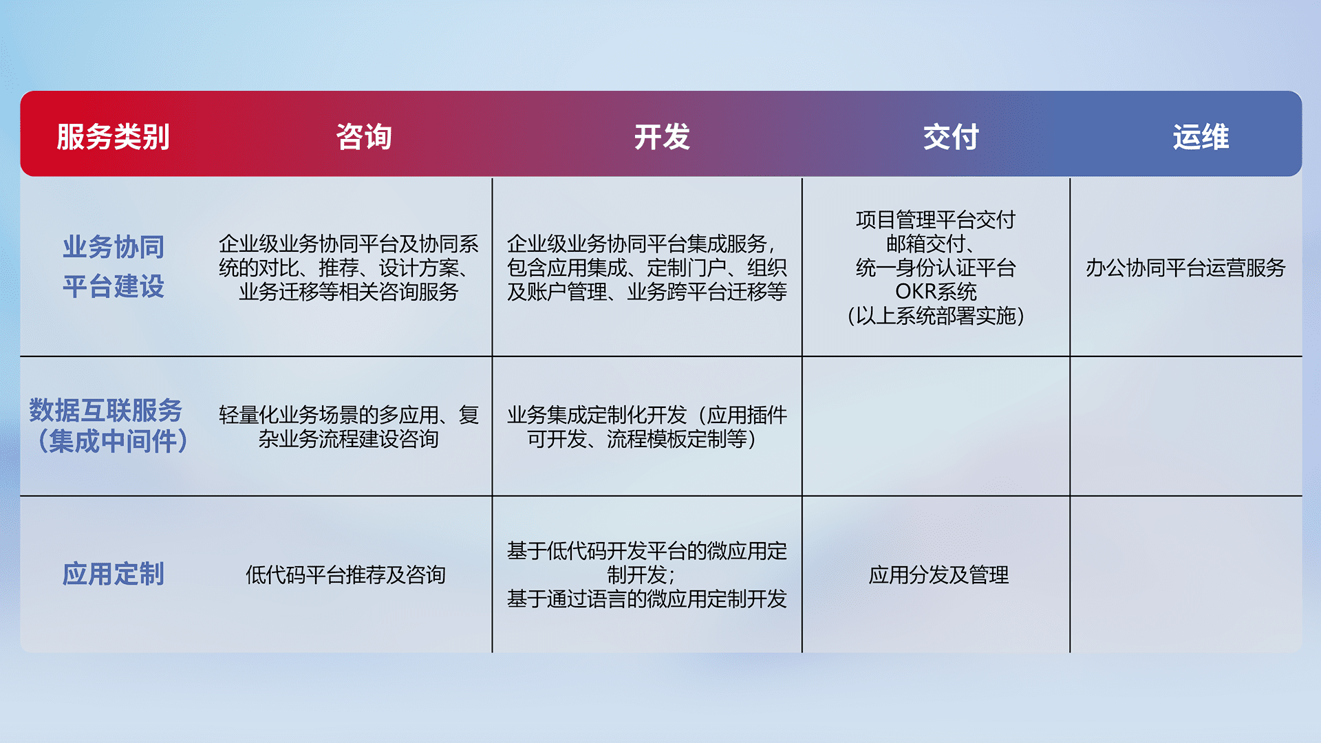 针对钉钉、、、、企微、、、IDaas等平台级产品提供产品的规划、、、方案、、交付、、定制化开发等服务,,,,实现如统一协同办公、、、智能客户服务、、、混合会议管理、、、智能数据查询、、等业务场景,,,,实现数字化转型。。。。